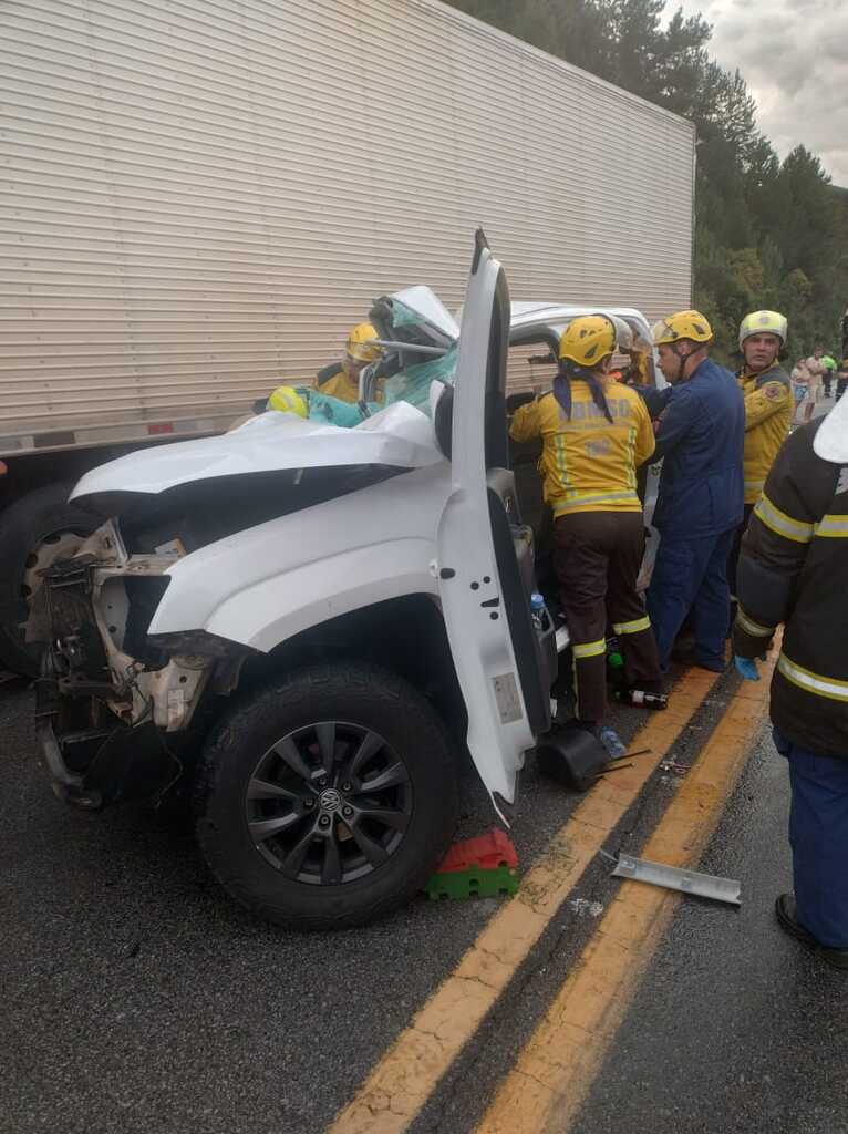 A colisão envolveu uma caminhonete Amarok e um caminhão e mobilizou equipes do Corpo de Bombeiros Militar de Santa Catarina, do Samu e da Polícia Rodoviária Federal.