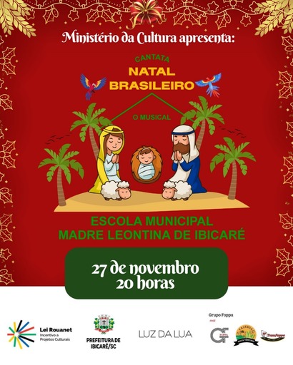 A magia do Natal vai iluminar Ibicaré na noite de quinta-feira, 27 de novembro, com a realização da Cantata Natalina – “Natal Brasileiro: O Musical”, apresentada pelos alunos da Escola de Educação Básica Municipal Madre Leontina. O espetáculo terá início às 20h, no pátio da escola, e promete emocionar o público com música, cor e luz.