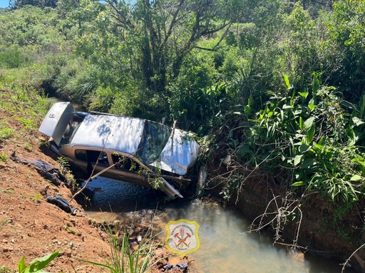 Um carro ficou atravessado em um córrego após sair da pista na manhã de quinta-feira, dia 6, na SC-350, em Caçador, no Meio-Oeste catarinense.