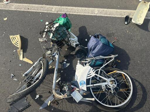 A bicicleta elétrica ficou completamente. A van teve danos no para-choque dianteiro e no capô.
