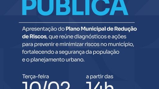 O Município de Joaçaba, por meio da Defesa Civil, convida a população para a audiência pública de apresentação do Plano Municipal de Redução de Riscos, que será realizada no dia 10 de fevereiro, às 14h, no Plenário Claudino Morandini, na Câmara de Vereadores de Joaçaba, localizada na Rua Tiradentes, nº 872, Centro.