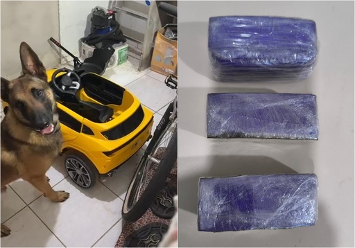 A equipe da Delegacia de Polícia de Fronteira, com apoio do Núcleo de Operações com Cães de São Lourenço do Oeste, iniciou as buscas no imóvel quando o cão de faro demonstrou interesse pelo brinquedo. A inspeção revelou três tijolos de maconha, que somaram 264 gramas já com a embalagem, guardados no interior do carrinho.