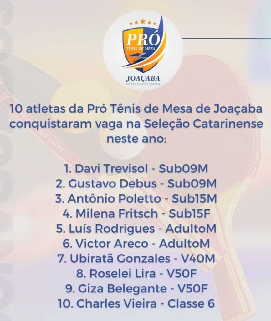 Após as seis etapas foram definidos os atletas que farão parte da Seleção Estadual, e da equipe joaçabense 10 mesa-tenistas conquistaram a vaga e o direito de representar Santa Catarina no Campeonato Brasileiro, que será realizado em dezembro em Blumenau.