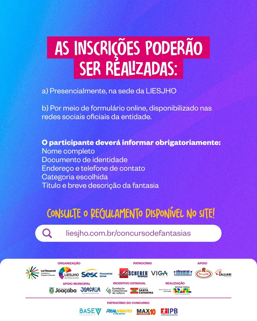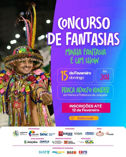 A partir das 19h30, a Praça Adolfo Konder, em frente à Prefeitura de Joaçaba, recebe o concurso de fantasia, com apresentações ao vivo e avaliação conforme critérios definidos pela organização.