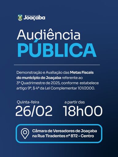 O município de Joaçaba convida todos os munícipes para participarem da Audiência Pública de demonstração da avaliação das Metas Fiscais do município de Joaçaba referente ao 3º Quadrimestre de 2025, conforme estabelece artigo 9º, § 4º da Lei Complementar 101/2000 – Lei de Responsabilidade Fiscal, que acontecerá na quinta-feira (26), às 18h, nas dependências da Câmara de Vereadores de Joaçaba, à Rua Tiradentes, nº 872, Centro.