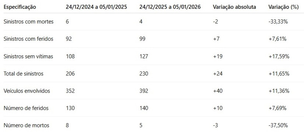 De acordo com o levantamento, foram 5 vítimas fatais durante a operação. Em 2024 foram contabilizadas 8 mortes, 130 pessoas feridas e 206 ocorrências de trânsito atendidas. Já no mesmo período referente à virada de ano 2025/2026, houve redução significativa no número de vítimas fatais, apesar do aumento em outros indicadores (veja a tabela abaixo).