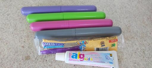 Para o desenvolvimento das atividades, foram distribuídos kits individuais com escova identificada, porta-escova também identificado e creme dental, conforme a faixa etária dos alunos.