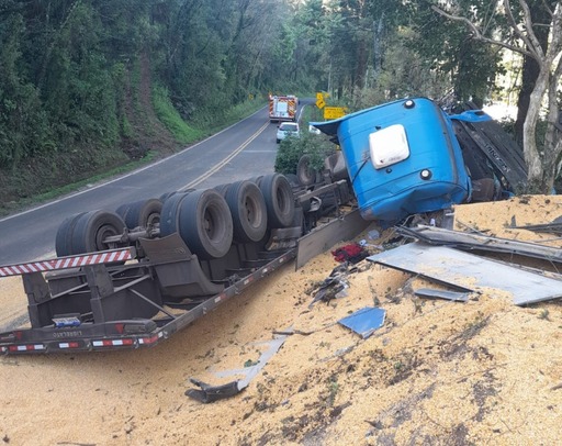 Um caminhão Scania, com placas do Paraguai e carregado de grãos de milho, tombou na tarde desta quinta-feira, dia 25, na SC-464, no trecho conhecido como curva do “Bambim”, sentido Arroio Trinta, em Salto Veloso. O acidente foi registrado por volta das 15h10 e mobilizou equipes do Corpo de Bombeiros Militar.