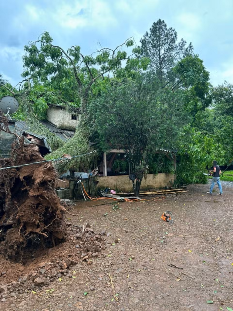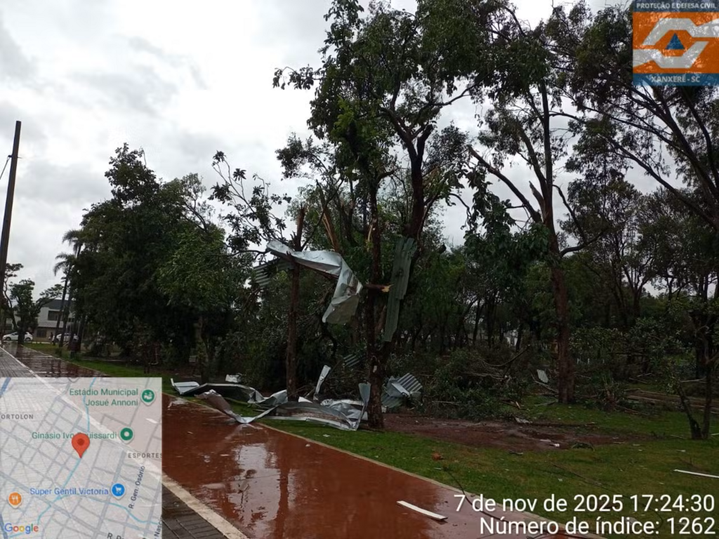 Em Xanxerê, uma forte tempestade com rajadas intensas de vento causou diversos danos materiais em várias regiões da cidade. Foram registradas ocorrências de destelhamentos, queda de árvores, postes e estruturas metálicas, além de danos em fachadas e muros.