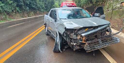 A caminhonete ficou com a dianteira bastante danificada após a colisão. Apesar dos danos, o motorista não se feriu e assinou recusa no atendimento médico.